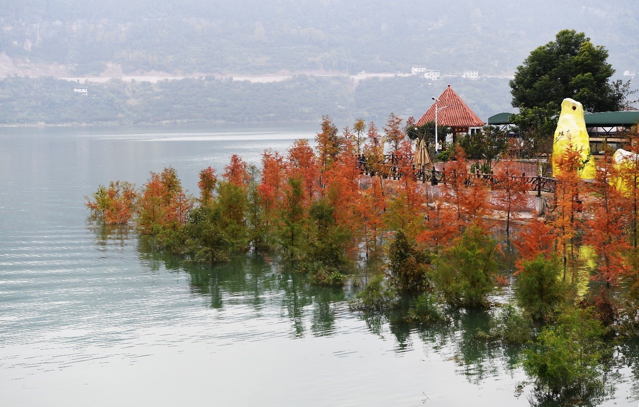 这是2020年12月10日在重庆市万州区大周镇长江边拍摄的“水中彩林”景象。从2009年开始,万州区陆续在长江两岸消落带栽植1800余亩中山杉,在涵养水源、绿化库岸、改善环境等方面发挥了作用。新华社记者 王全超 摄