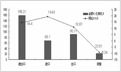 最新统计显示,今年上半年,我国医疗器械进出口贸易额达158.21亿美元,同比增长14.4%。其中,医疗器械进口额为68.1亿美元,同比增长19.43%;出口额为90.11亿美元,同比增长10.87%;贸易顺差22.01亿美元,同比下降9.24%。