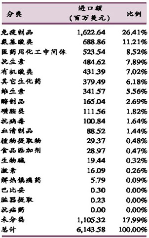 进出口原料药的结构稳定,在细分可能的产品类别后可以看出,免疫制品、氨基酸类和抗生素类原料药是构成进口商品的主要成分,这个构成近些年没有发生明显的改变。