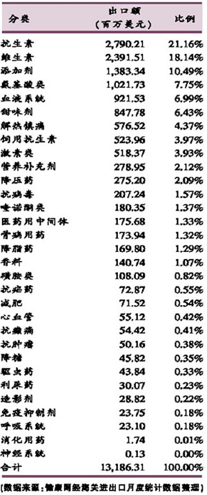 在出口商品中,抗生素、维生素、氨基酸类、有机酸类和动物脏器提取的生化类原料药仍是出口的主要构成。除了上述大类原料药出口构成之外,甜味剂、沙坦类降压药、小品种类维生素原料药等逐渐显示出强势。