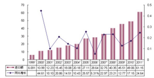 图1:1999-2011年原料类商品进口额变化(单位:亿美元)
