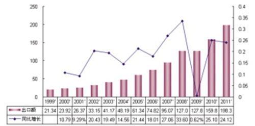 图2:1999-2011年原料类商品出口额变化(单位:亿美元)