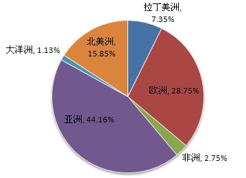 据中国海关数据统计,2012年一季度,我国化学原料药出口额为56.5亿美元,同比增长了5.4%,占医药保健品出口总额的51.3%;出口量为150万吨,同比下降0.39%。主要出口市场仍为亚洲、欧洲和北美洲,对应的出口额分别为24.9亿、16.2亿和8.9亿美元。这三大传统市场所占比重总计达88.7%。