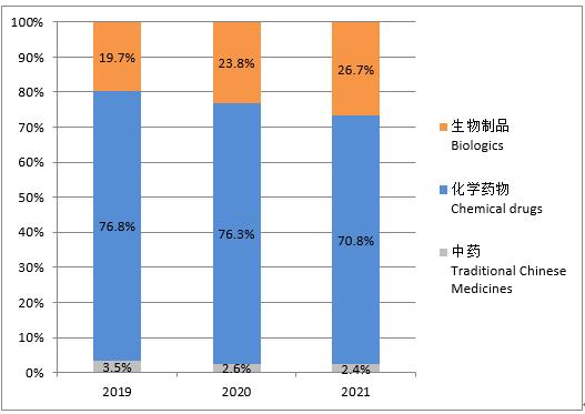 According to the statistics by drug type of traditional Chinese medicines, chemical drugs and biological products, in 2021, the drug clinical trials in China were still dominated by chemical drugs, accounting for 70.8%; followed by biological products, 26.7%; and traditional Chinese medicines were the least, 2.4%. Compared with the data in the past three years, the proportion of clinical trials of various drugs was similar, but the proportion of biological products showed an increasing trend year by year, and the proportion of chemical drugs and traditional Chinese medicines showed a decreasing trend year by year.