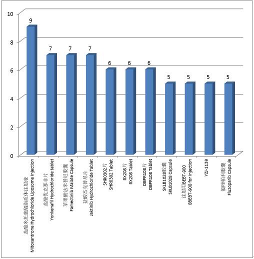 Chemical drugs: A total of 68 trials were registered for the top 10 varieties of chemical drug clinical trials in 2021, with the most trials conducted for mitoxantrone hydrochloride liposome injection (9 trials). Compared with 2020, the similarity is that the top 10 varieties all contain the anti-tumor drugs mitoxantrone hydrochloride liposome injection, famectinib malate capsule, jaktinib hydrochloride tablet and fluzoparib capsule, and the difference is that the top 10 varieties contain 4 nonantitumor drugs, yonkenafi l hydrochloride tablet, SHR0302 tablet, DBPR108 tablet and YZJ-1139 respectively. According to the data analysis in the past three years, each year more than 50% of the top 10 varieties were anti-tumor drugs, of which fluzoparib capsule was one of the top 10 varieties in the past three years.