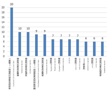 Biological products: In 2021, a total of 104 trials were registered for the top 10 varieties in the number of clinical trials carried out for biological products, mainly therapeutic biological products, involving a total of 75 trials of 10 varieties (72.1%); prophylactic biological products involved 29 trials of 2 varieties (27.9%), all of which were COVID-19 vaccines. From the analysis of the number of clinical trials of a single variety, the number of clinical trials carried out for the inactivated COVID-19 vaccine (Vero cells) was the highest, 20, followed by tislelizumab injection and atezolizumab injection, 10 for both, and both of them were among the top 10 varieties in 2020. Compared with the data in the past three years, the top 10 varieties were mainly therapeutic biological products, with the highest proportion of 88.7% in 2019 (94vs.106). Pembrolizumab injection was one of the top 10 varieties in the past three years.