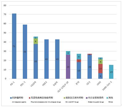 According to the statistics by drug varieties, the top 10 targets of clinical trials registered in 2021 are PD-1, PDL1, VEGFR, HER2, etc., and the number of varieties are as many as 71, 59, 46 and 43, respectively (not repeatedly counted by "acceptance number" field), of which more than 90% of the drug indications of 5 targets (PD-1, PD-L1, HER2, EGFR and CD3) are concentrated in the antitumor field, and all the drug indications of 4 targets (PD-1, PD-L1, HER2 and EGFR) are concentrated in the anti-tumor field.